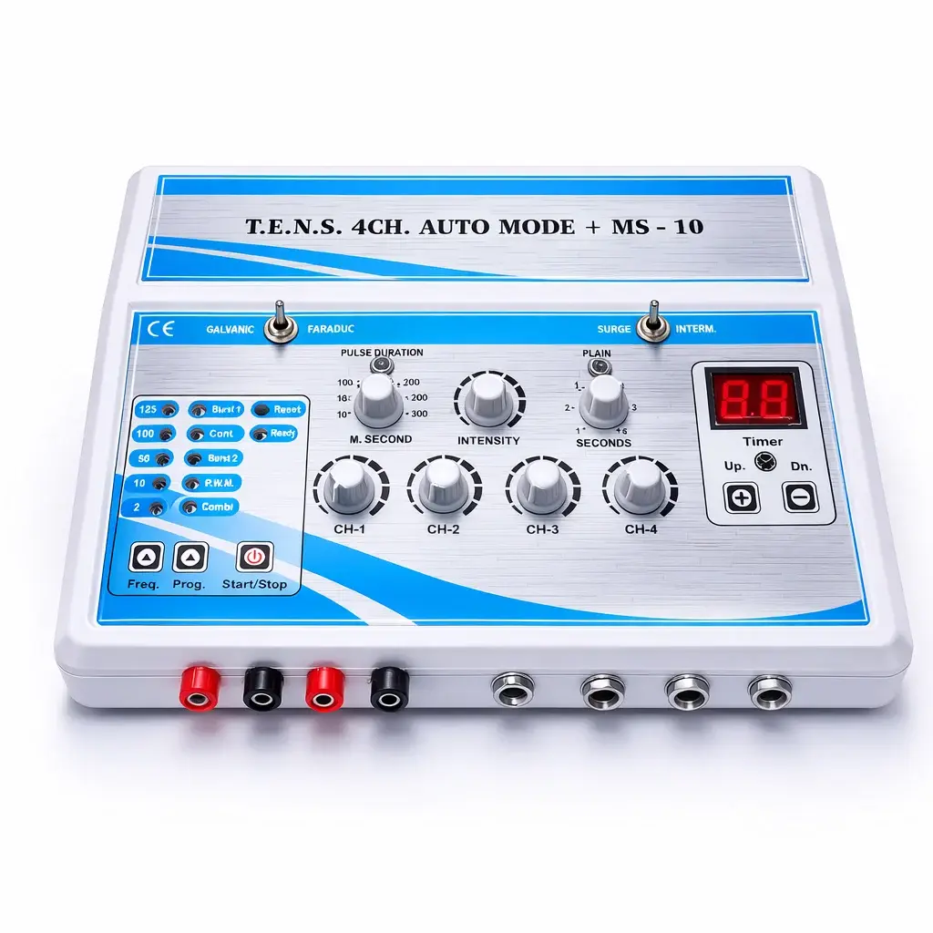 Professional 4 Channel Auto Mode TENS with MS-10 Muscle Stimulator (Diagnostic Model) designed for advanced pain relief and muscle rehabilitation. Ideal for physiotherapy clinics, hospitals and rehab centers.