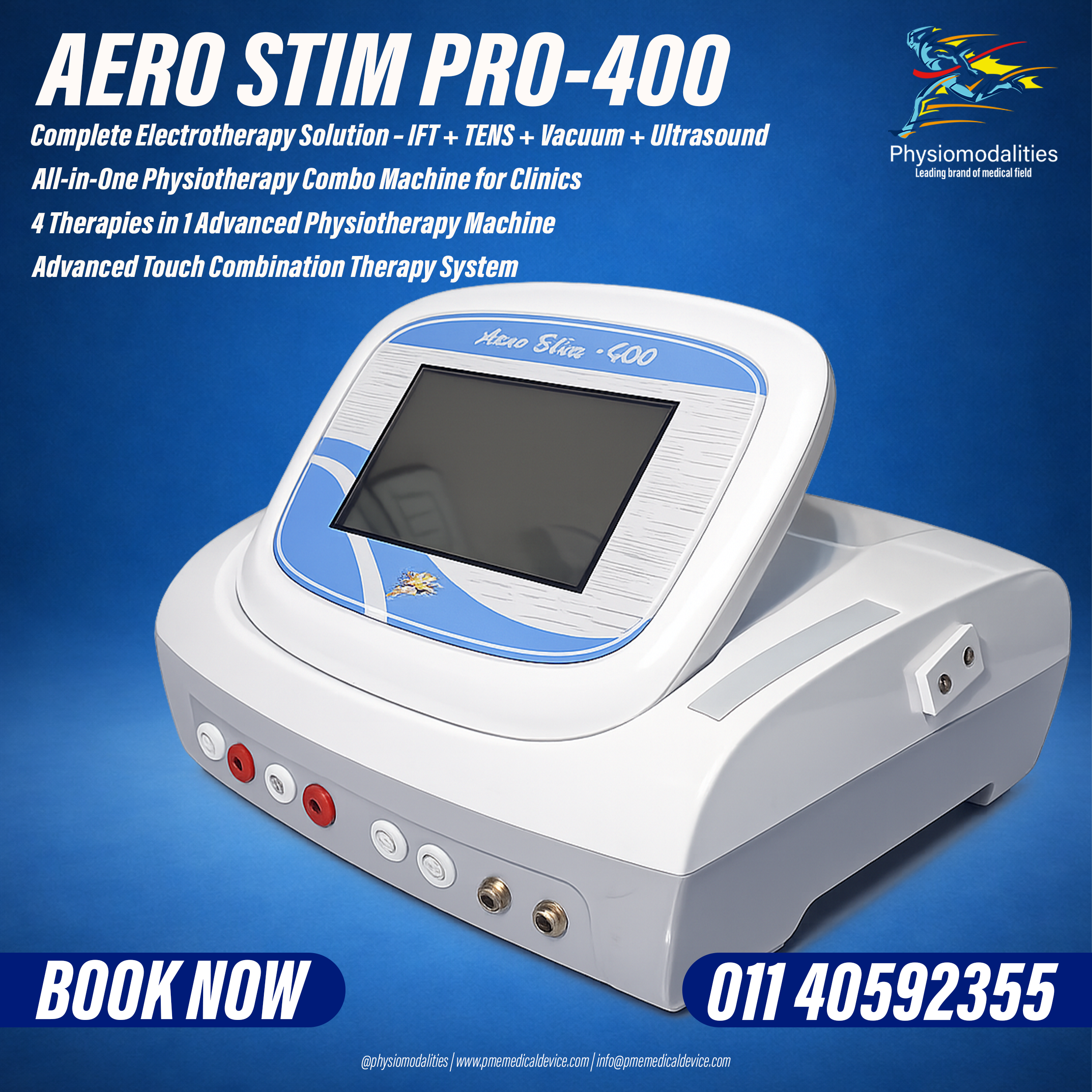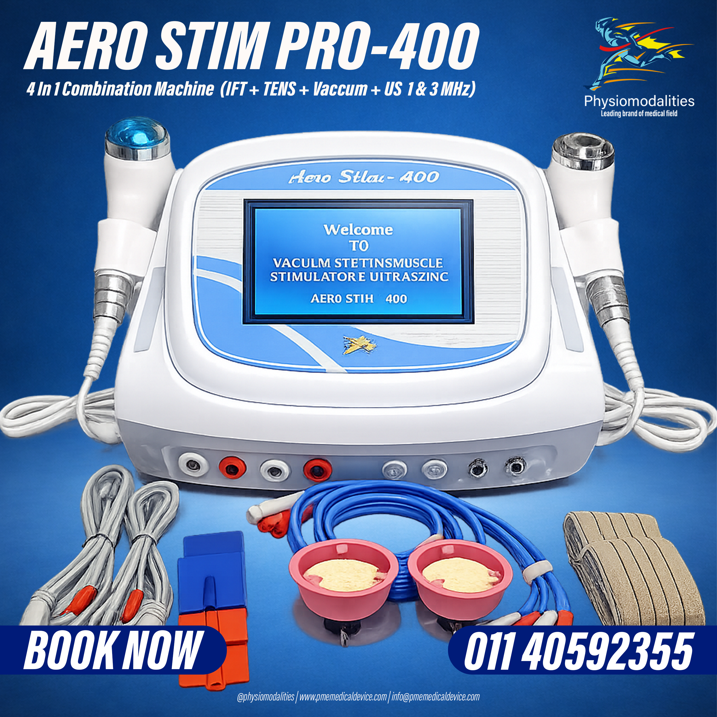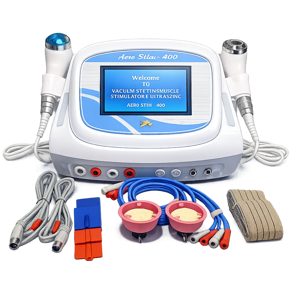 The AERO STIM PRO-400 is a professional 4-in-1 electrotherapy and ultrasound physiotherapy machine designed for advanced pain management and rehabilitation therapy. This compact system combines IFT (Interferential Therapy), TENS Therapy, Vacuum Therapy, and Therapeutic Ultrasound to deliver effective treatment for musculoskeletal pain, muscle stimulation, circulation improvement, and tissue healing.