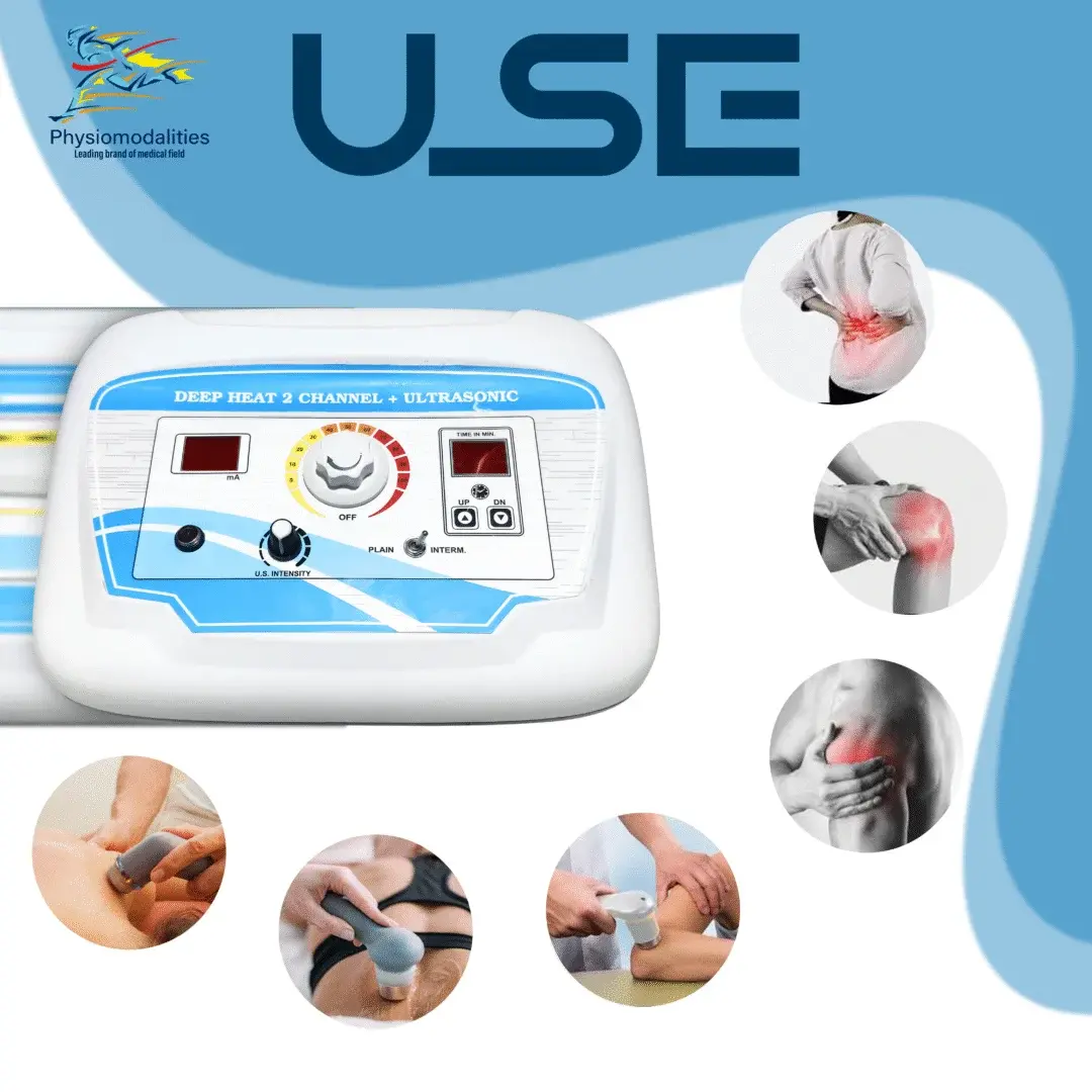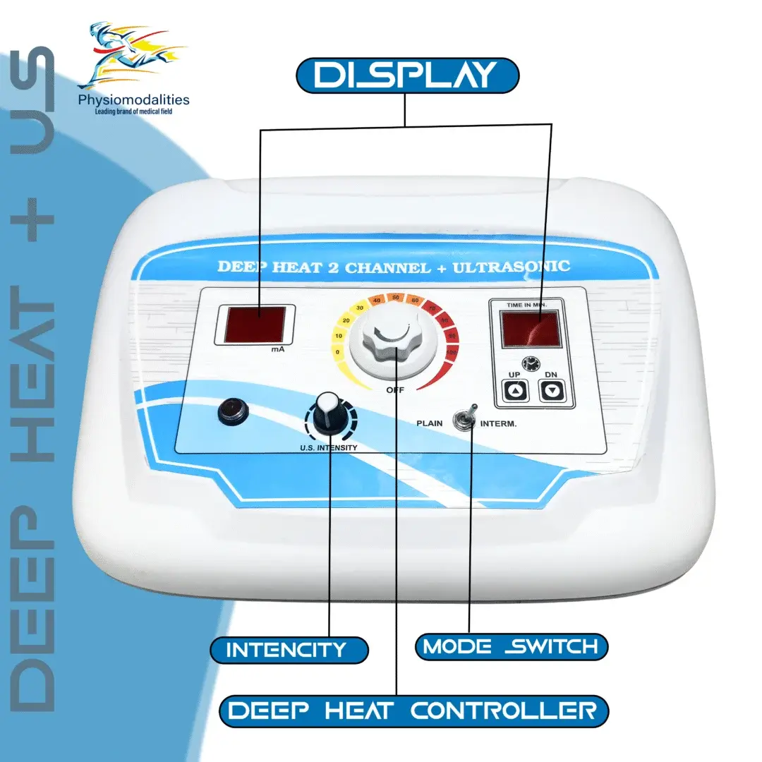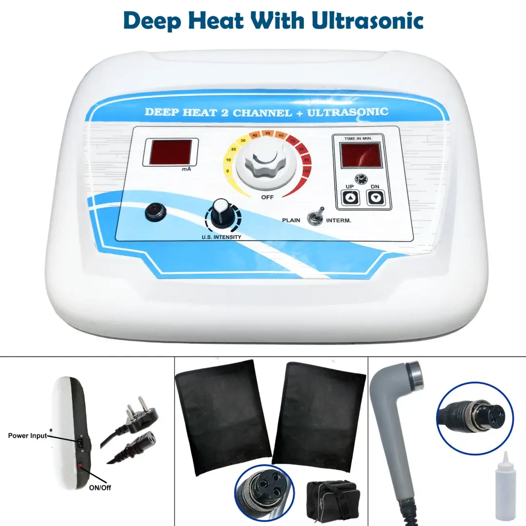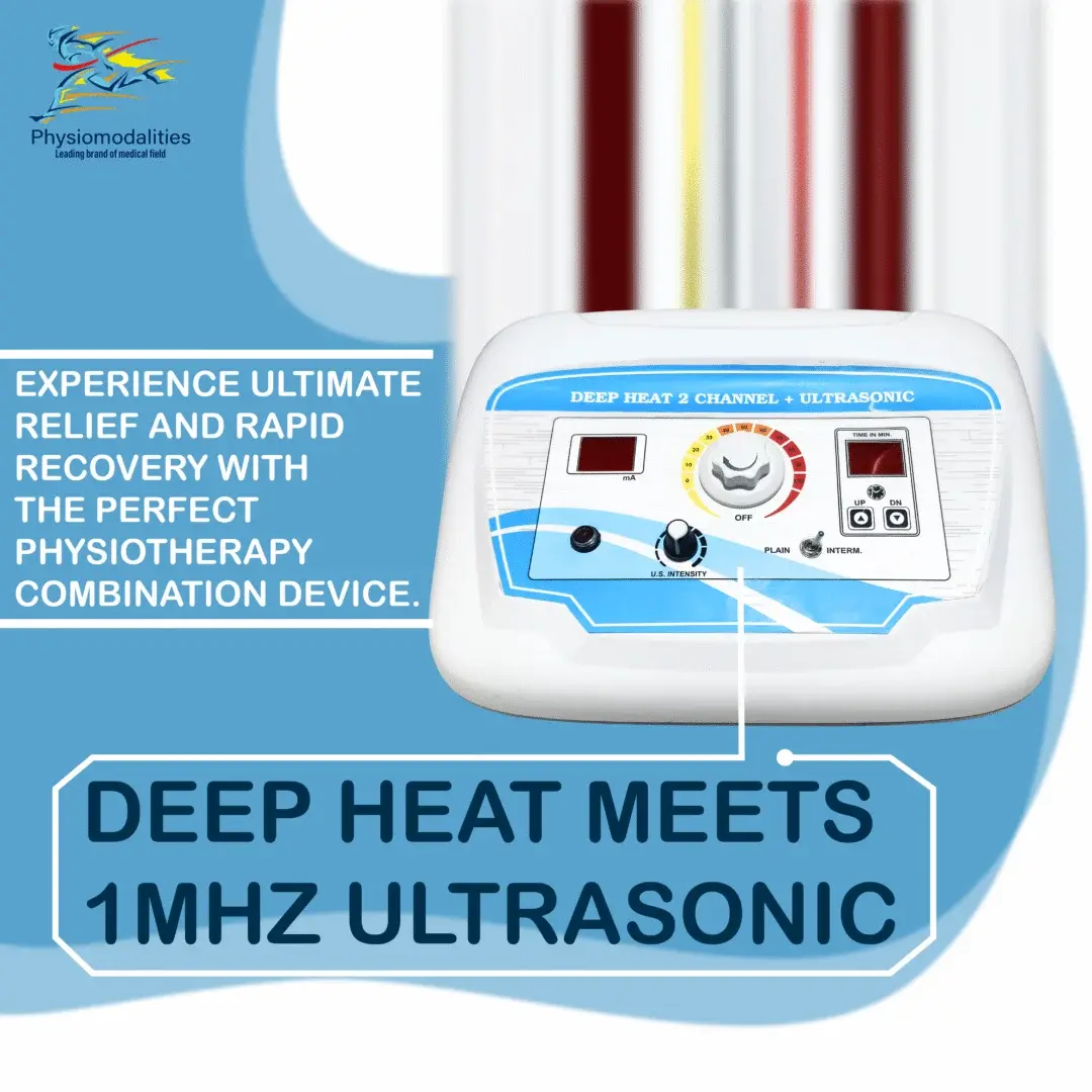 Upgrade your physiotherapy clinic with Deep Heat 2 Channel + Ultrasonic Therapy Machine – a powerful combination device designed for deep tissue pain relief, muscle stimulation, and faster recovery.